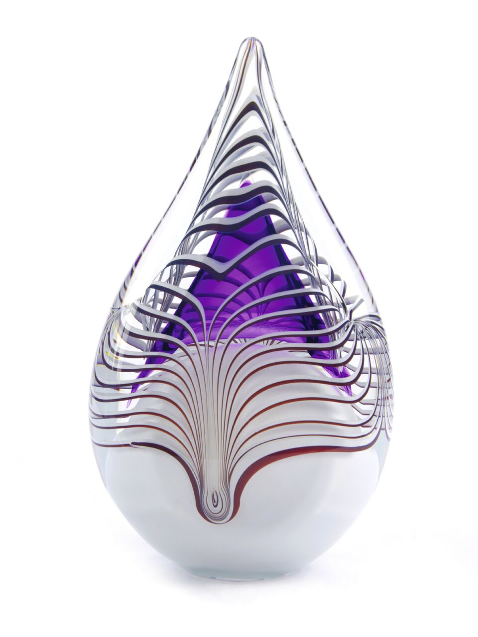 Dit prachtige as-gedenkornament heeft de vorm van een sierlijke grote druppel. De kleurschakering van de grote druppel is opgebouwd uit een opake (niet transparante) melkwitte onderzijde die vervolgens doorloopt in een krachtige paarse kern. De grote druppel is afgewerkt met sierlijke lijnen in de kleuren wit en donker cognac. In de melkwitte kern bevindt zich het as-reservoir waar een gedeelte van het crematie-as in bewaard kan worden. D.m.v. een zelf-hechtende sluitplaat wordt het as-reservoir afgesloten. Het as-reservoir is niet transparant waardoor het crematie-as niet zichtbaar is. De grote druppel is meer dan een as-gedenkornament. Het is een waar kunstwerk ter herinnering aan uw dierbare. Deze grote druppelĀ is ook verkrijgbaar in de kleuren: roze, groen, zwart, blauw, cognac en een kleurencombinatie van geel en blauw. Alle as-gedenkornamenten zijn van kristalglas en worden met de hand vervaardigd. Dit maakt elk ornament uniek.